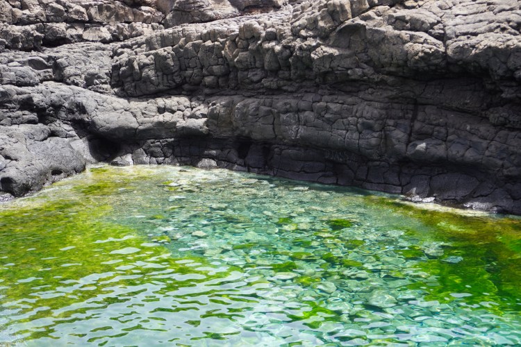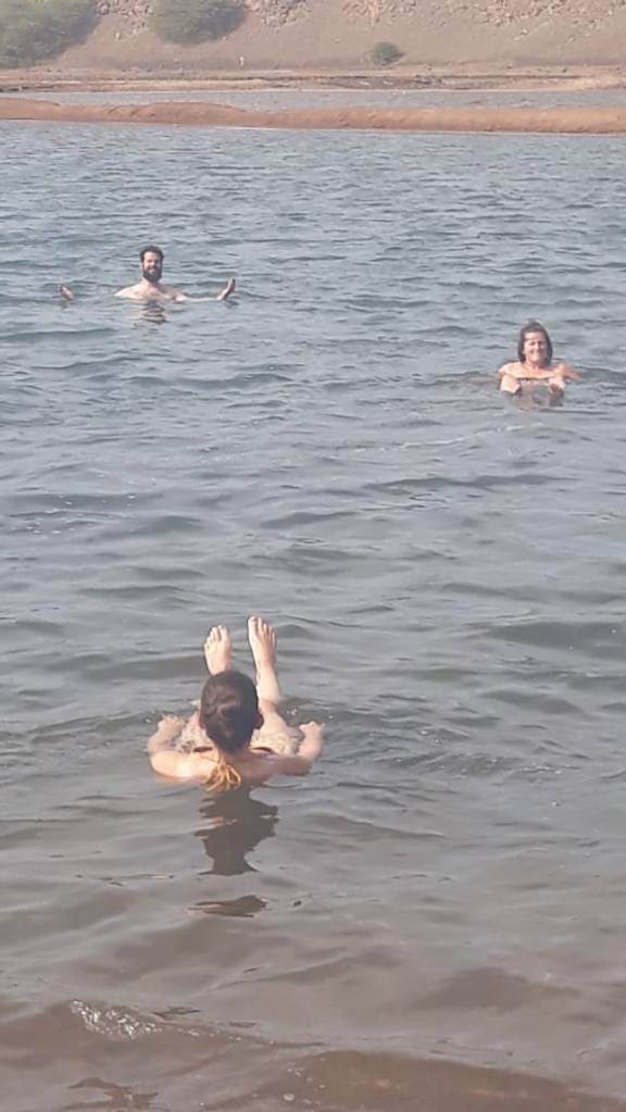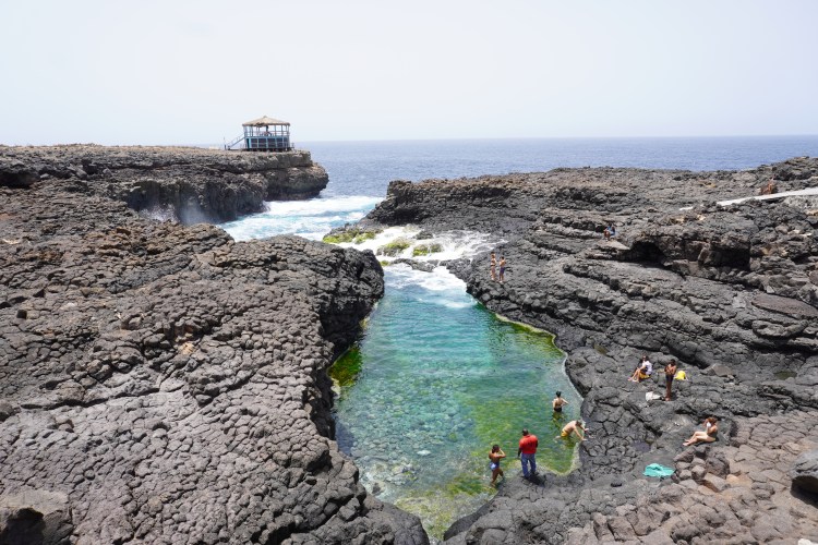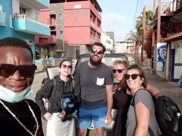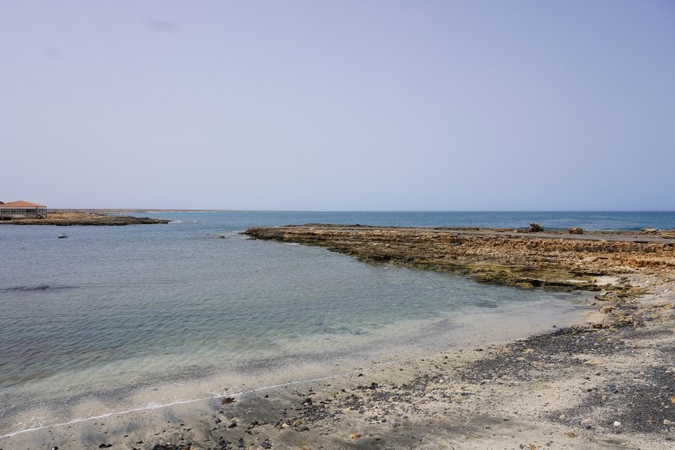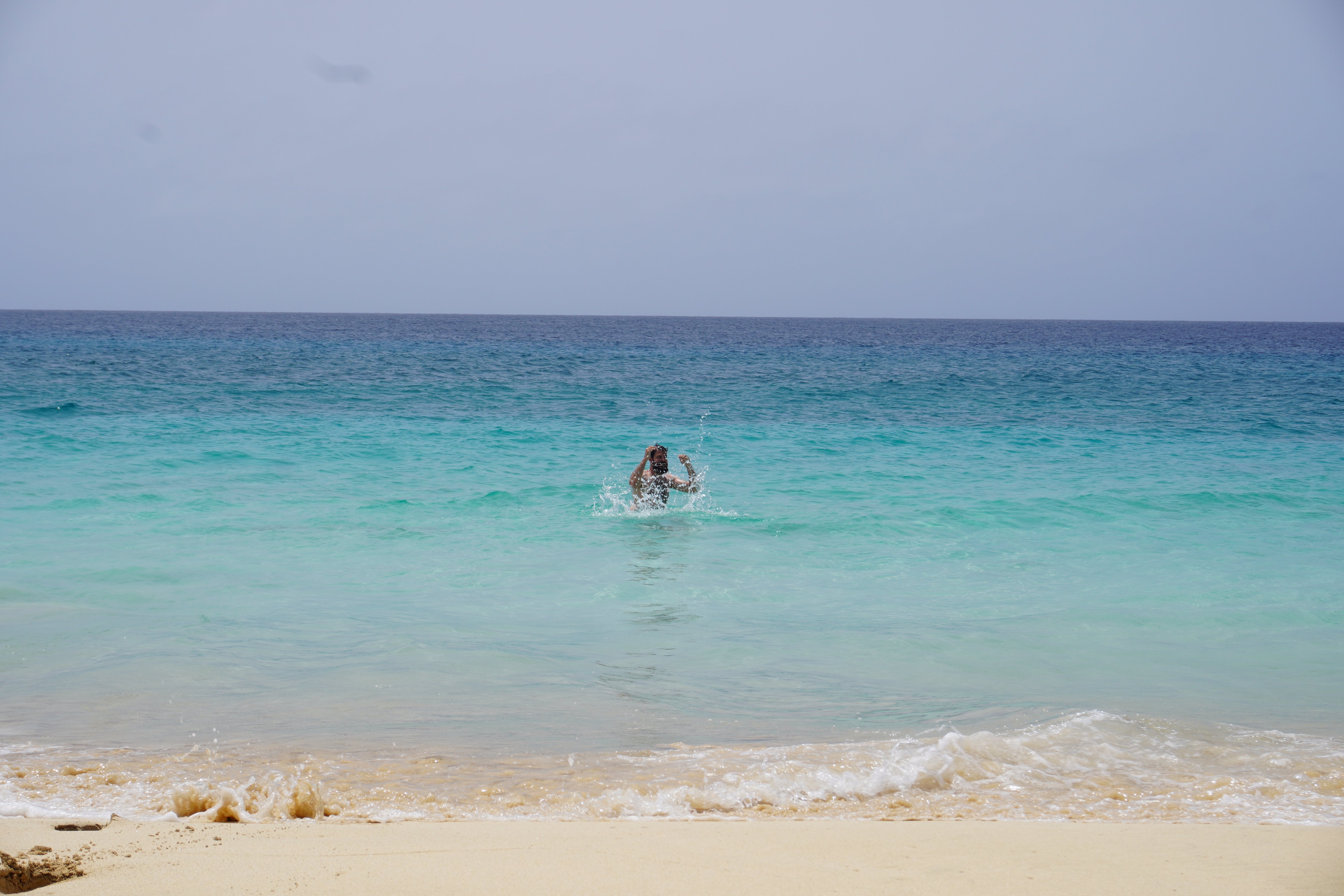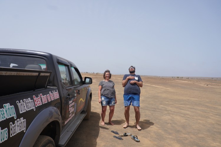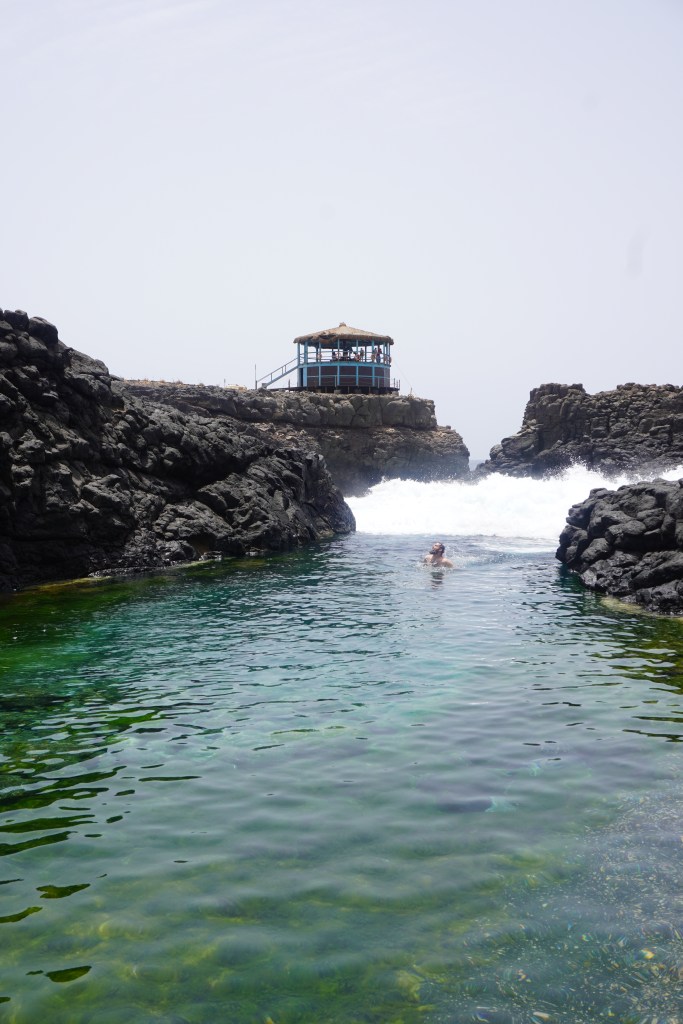 Zuerst fuhren sie mit uns nach «Mudeira» von wo man den Blick auf den «Monte Leão» (schlafenden Löwen) bestaunen konnte. Weiter ging es in die Hauptstadt «Espargos». Die Stadt ist nach den gelben Spargeln benannt, die überall aus dem Boden schiessen – aber leider nicht essbar sind. Da wir zur Znüni-Zeit in Espargos waren und alle nach Kaffee schrien, machten wir natürlich einen kurzen Stopp – der es in sich hatte. Da wir drei Neuankömmlinge den typischen Schnaps «Grogue» bis anhin noch nicht degustierten, bestand vor allem Caramau darauf, dass wir den zum Znüni mal so reinhauen. 2 Shots und gefühlt 0.5 Promille später – ging es leicht «angesüsselt» weiter zum Fischerdorf Palmeira. Ein nettes, farbenfrohes Dörfchen. Auch auf Sal findet man ein «Blue Eye» – und direkt daneben die «Buracona»-Bucht. Das dauerte gefühlte 10 Sekunden und Seebi steckte in den Badehosen. Das Wasser ist Glasklar und durch die Wellen fühlte sich die riesige Badewanne wie ein grosses Sprudelbad an. Die beiden anderen Frostbeulen «tönkleten» einen kurzen Augenblick ihre Zehen darin – das musste reichen. Als wir dann Seebi wieder rausgefischt hatten – ging es Richtung Nirgendwo. Und zu unserem Erstaunen sahen wir dort «Fata Morganas». Ganz eindrücklich. Ja man hat wirklich ein wenig das Gefühl – dass man den «Verstand» verloren hat. Man sieht etwas, was gar nicht da ist. Und das lag nicht am Znüni-Schnaps. Das hat uns zumindest Michaela gesagt und sie machte ja diese Tour nicht zum ersten Mal!!