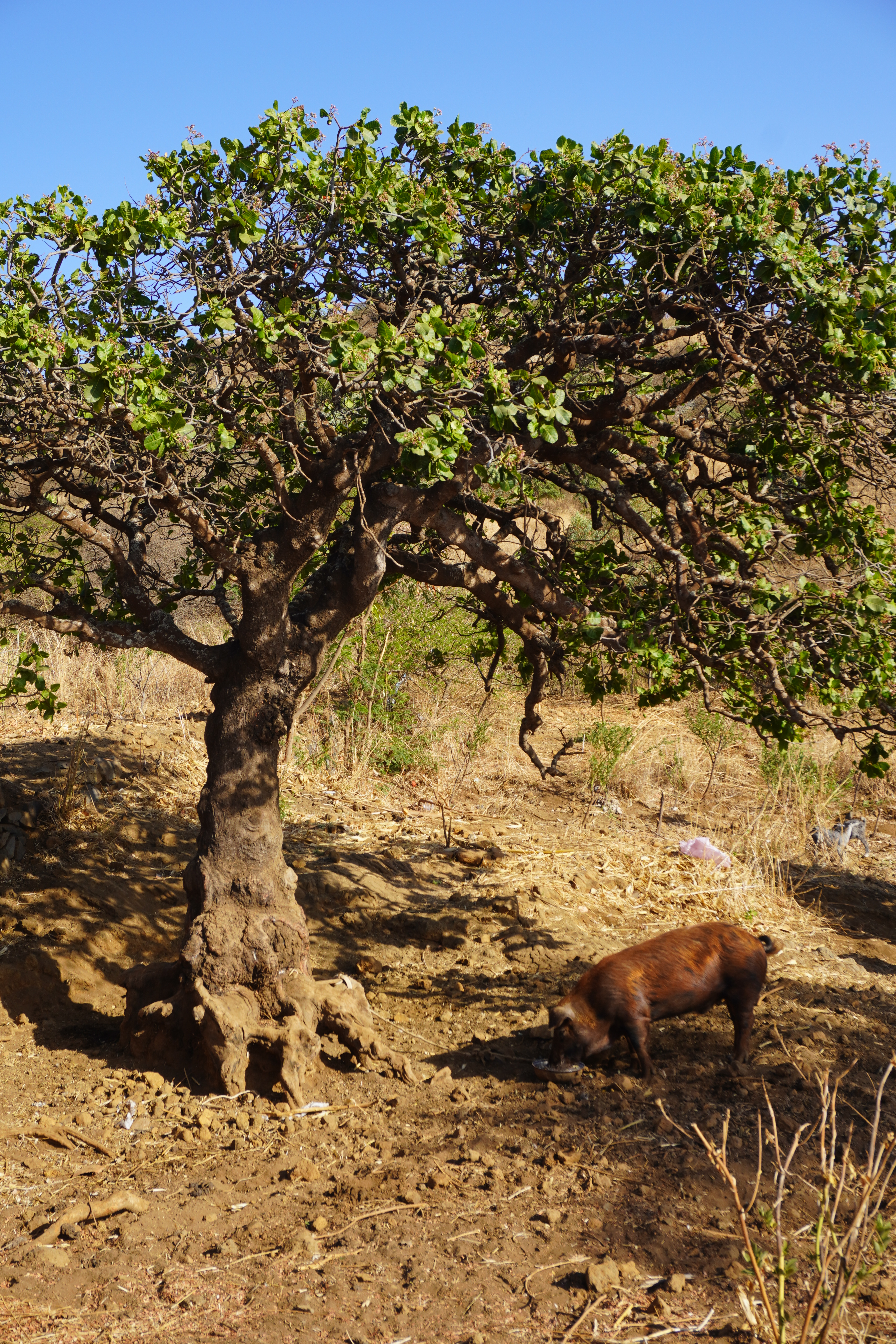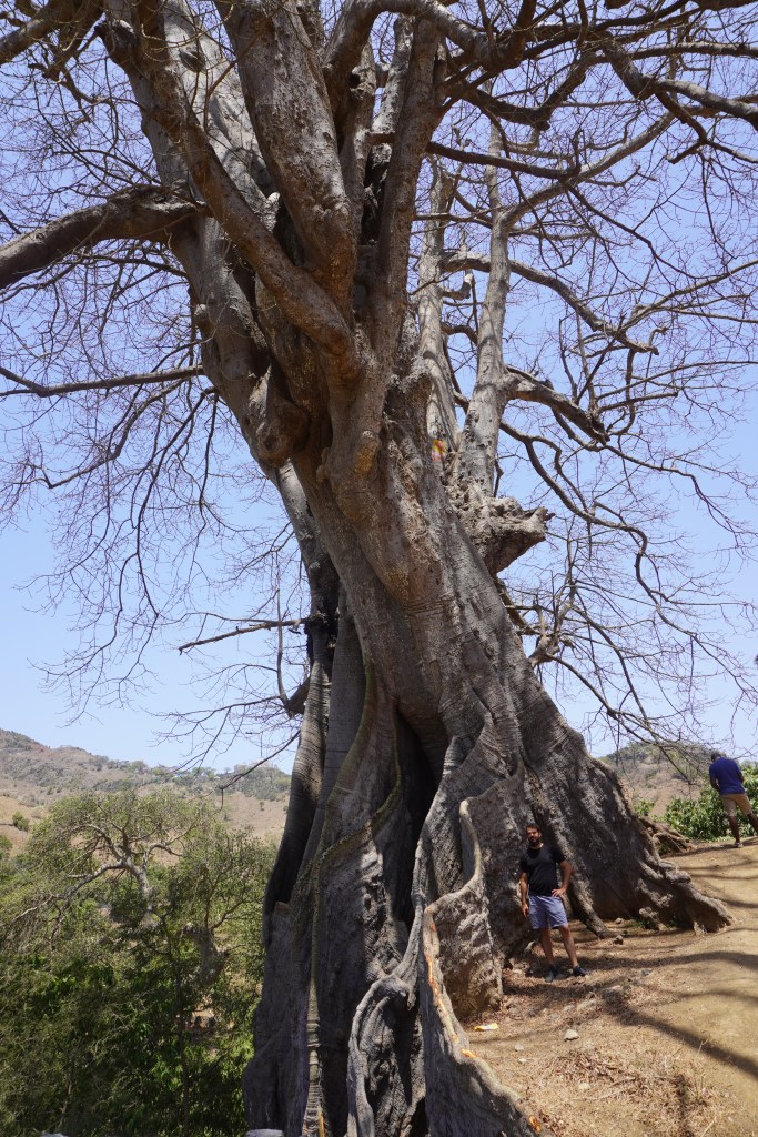 Die Fahrt führte uns weiter zu einer Landwirtschaftsschule. Dort lernen angehende Agronomen, was es alles braucht für eine optimale Ausnutzung der Ressourcen. Nahe der Stadt Assomada steht der dickste und älteste Baum der Inselgruppe. Der Poilon, ein alter Kapokbaum, ist geschätzte 500 Jahre alt und hat einen Umfang von fast 40 Metern. Um zum Kapokbaum zu Fuss zu gelangen, kommt man an einer traditionellen «Schnapsfabrik» vorbei. Hehe, diese lustigen Kerle sind auch den ganzen Tag «angbedusselt». Die Frucht wird 12 Tage eingelegt bis sie gärt. Der Ofen wird noch traditionell mit Holz eingefeuert. Über ein Rohr gelangt dann das Hochprozentige in ein Auffangbecken. Das wird dann vom «Meistro» streng bewacht. Nur schon von ein paar Atemzügen war uns bestens bewusst, dass das nichts für eine schwache Leber ist.