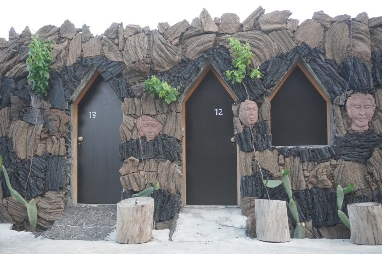 Ein kleiner Junge sass im 30-minütigen Flug von Santiago nach Fogo hinter uns. Als er die Insel erblickte, blühte er auf und «feuerte» die Insel regelrecht an: Fogo-Fogo-Fogo!! Wir imitierten den Knirps in den folgenden Tagen noch öfters. Süss. Da wir leicht verspätetet ankamen, wartete José Doce geduldig auf uns. No stress! *zwinker* In seinem 4×4 ging es zuerst zum lokalen Markt in die Stadt «São Felipe». Er musste noch die Besorgungen für unser Nachtessen machen. Wir schlenderten wie zwei Volltouristen durch das Gewimmel dieser vielen Leute. Also eigentlich suchten wir uns einen Platz im Schatten und bestaunten das Durcheinander. «Heiterebeck». Hier noch ein Fisch über die Gasse, dort ein Pannenfahrzeug mitten auf der Strasse (stand wahrscheinlich schon vier Tage dort) und überall Frauen mit Essbarem, welches Sie auf ihren Köpfen durch die Gegend trugen. Zwischenzeitlich lies José auf dem Parkplatz vom Schlüsselservice «Xavi» einen Zweitschlüssel für seinen PW anfertigen. Nach allen Besorgungen ging dann die 1.5 stündige Fahrt los. Doce heisst Süssigkeit übersetzt. Aber die Fahrt war alles andere als süss – «holperig» würde es eher treffen. Unser neues Zuhause für die nächsten fünf Tage auf 1’700 m.ü.M. heisst «Pensao Casa José Doce» in «Portela Chã das Caldeiras» und wie es der Name schon sagt, ist José der Hausherr. Wir sind mal wieder die einzigen Gäste und haben eine ganze Wohnsiedlung für uns. José baute aus eigener Kraft ein «kleines» Dorf. 17 Casas, ein Gemeinschaftsraum, eine Terrasse und alles aus Lavastein gefertigt. Ein Künstler zugleich. Alle Figuren, welche er in den Bau integrierte, sind von ihm selbst gefertigt. Auch bekochte er uns, organisierte uns eine SIM-Karte, führte uns als Guide auf den Vulkan und zeigte uns die Insel. Ein Allrounder schlechthin.