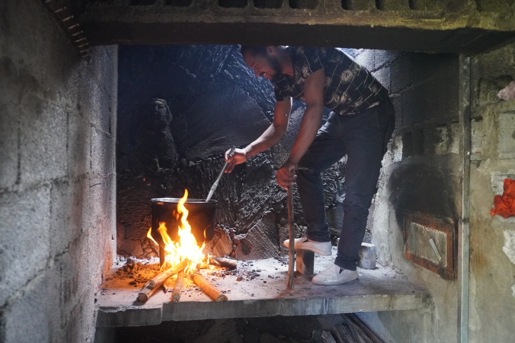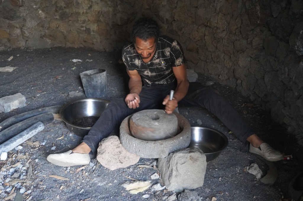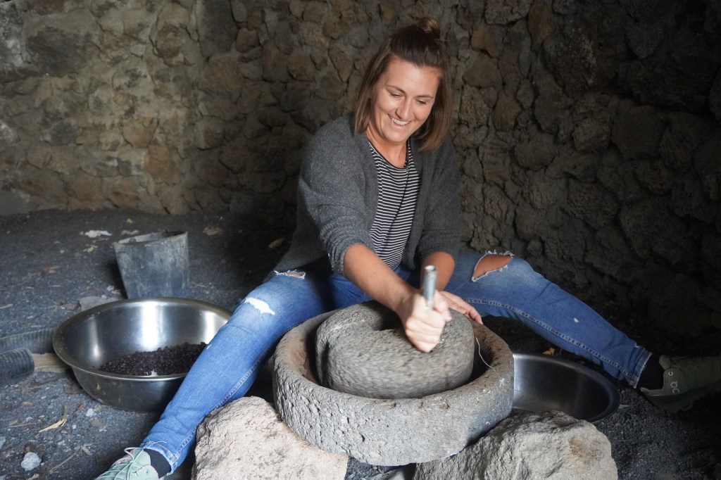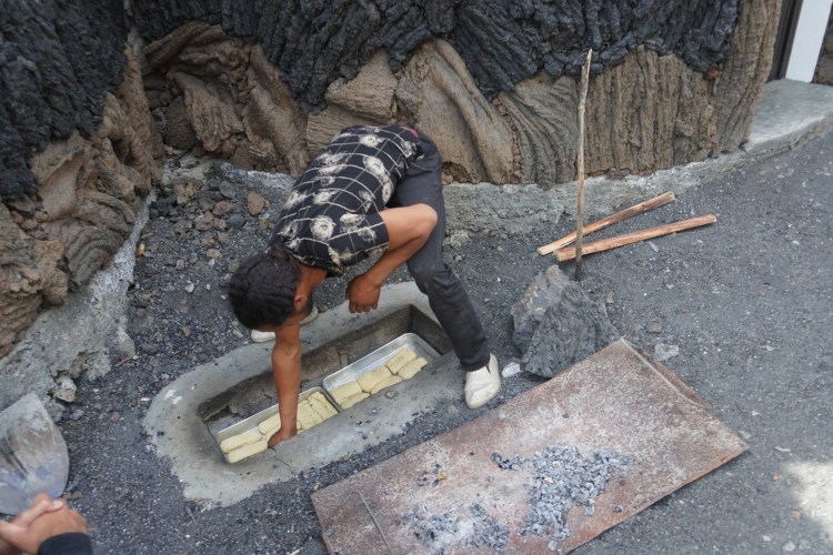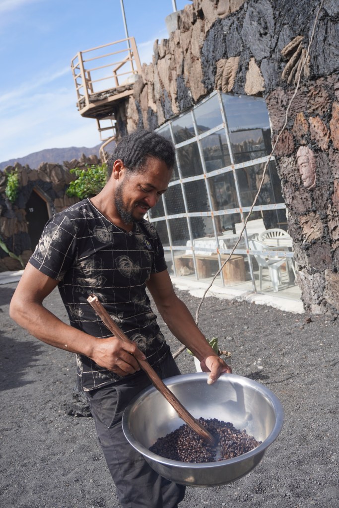 Das erste Abendessen schmeckte sehr gut. Fisch-/ Gemüseeintopf à la José, begleitet mit Reis. Er kochte für eine ganze Fussballmannschaft. Und es war schwierig für uns ihm zu verklickern, dass uns das Essen wunderbar schmeckte, aber es viel zu viel war. Am nächsten Morgen gab er alles. Als wir aufstanden, rief er uns zu sich. Er röstete in seinem «Ofen-Haus» frische Kaffeebohnen, die wir dann in einem anderen Haus nebenan, gemeinsam traditionell von Hand mahlten. Das selbstgemachte Brot backte zwischenzeitlich im Ofen – direkt vor unserem Casa – in der Erde. Das Feuer obendrauf sorgte für die richtige Temperatur. «Läck», das Frühstück mit dem lauwarmen Brot und dem frisch gemahlenen Kaffee war genau das Richtige. Denn anschliessend erkundeten wir die Lava-Region. Wir liefen einmal zum Wald und wieder zurück. Sehr eindrücklich, diese Landschaft. Wald würden wir dem jetzt nicht sagen – eine Reihe von Bäumen trifft es wohl eher. Aber schon verrückt – wir sahen Bäume, die wie verbrannt waren und doch weiter lebten. Saftiges Grün – richtig kitschig und wie gemalt.