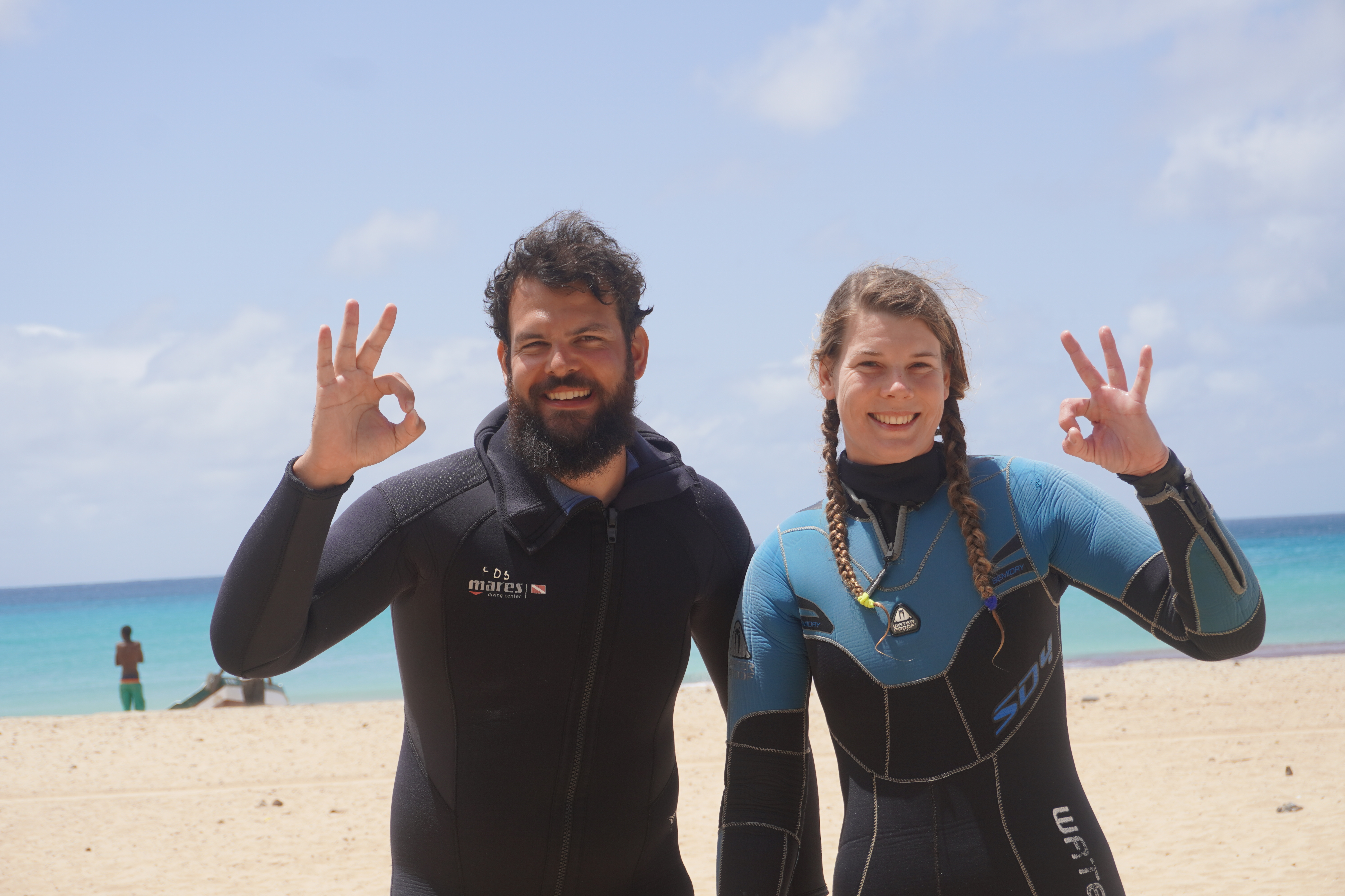 Am Ostermontag starteten wir beide mit der Tauchschule. Seebi feiert die Unterwasserwelt. Ela kann das nicht. Das mit dem Atmen unter Wasser ist nichts für sie. Und bevor Ela das ganze Meer «aussauft» – lässt sie es lieber. Seebi als «Atemschützler» feierte es natürlich, mit einer Sauerstoffflasche am Rücken die Schätze vom Meer zu entdecken. Nicht nur das Tauchen gehört dazu, auch Theorie musste gebüffelt werden und Überlebensübungen am Pier von Santa Maria gehörten zum Pflichtprogramm. Fanny, die VIP-Tauchlehrerin der Tauchschule «Eco Dive School Cabo Verde» machte einen top Job. Seebi war der erste Tauchschüler seit März 2020 (kein Schreibfehler)!! Herzlichen Dank an das ganze Team von Sandra. Der Captain manövrierte sie jeweils wieder sicher an Land und Samba war an Land der Chauffeur vom Toyota mit Charakter sowie «rüstete» und wartete sämtliches Material.