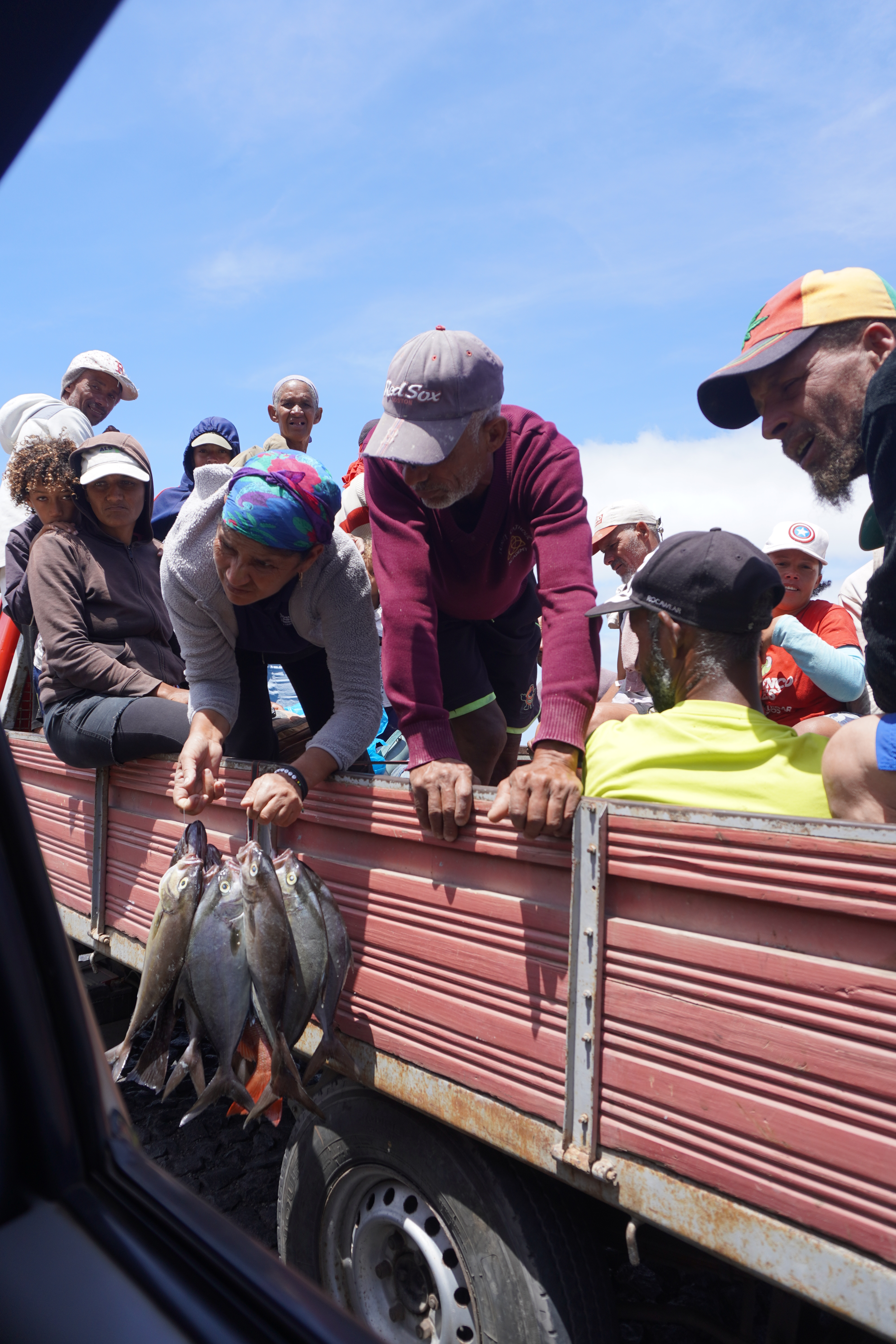 Weiter ging es. Zuerst fuhren wir in irgend so in ein Dorf. José fragt uns am Abend zuvor, ob er jemanden mitnehmen darf, wo auch gerne Inseltouren anbieten möchte, um Erfahrungen zu sammeln. Kein Problem. Es war Celine. Hehe – wir sind ja auch nicht auf den Kopf gefallen. Erstens wussten wir schon von diversen Telefonaten, wer Celine sein konnte und dann sah sie auch noch unverschämt gut aus. Die Inseltour mit dem liebevollen José war so eine Sache. Eigentlich war es eine Runde um die Insel auf der einzigen Hauptstrasse – und die ist ja wirklich, wie bereits vorhin erwähnt, alles andere als «geschmeidig». Das Mittagessen beim lokalen Restaurant haute uns dann auch nicht um. Es ist eine Wohnung und die Terrasse wurde als Restaurant umgemünzt. Fazit: Immer zuerst essen und erst dann den Besuch zur Toilette. «Scheiss» auf die Kalorien, frittiert ist immer gut und ja nicht zuviel überlegen, wer was wie zubereitet hat. Nein-nein, Bilder geht weg.