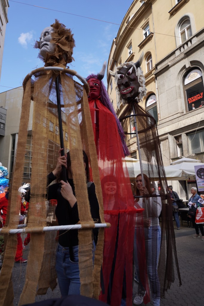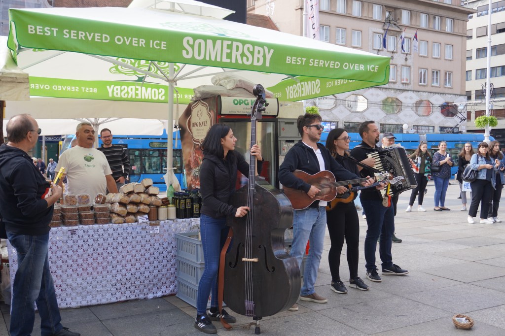 Der «Ban-Jelacic-Platz» ist mit Abstand der zentralste Ort Zagrebs. Am Samstags ist dort «Špicazeit». Es ist der Tag, um Markteinkäufe zu erledigen. Man hält einen Schwatz mit dem Lieblings-Produzenten und nachdem man seinen Einkaufskorb mit den frischen Lebensmitteln gefüllt hat, gönnt man sich im Anschluss einen Kaffee und beobachtet, möglichst fein herausgeputzt, die vorbeilaufenden Passanten. Dabei gilt das Motto: «sehen und gesehen werden». Das ist in Zagreb Tradition und als solche hat dieses Ritual einen eigenen Namen: Špica. Diesen Begriff gibt es nur in Zagreb. Das Charakteristische am «Bauernmarkt» sind seine roten Schirme. Sie schützen die Marktfrauen, die «Kumice», vor Sonne und Regen. Auch kamen wir – per Zufall in den Genuss eines kleinen «Fasnacht-Umzugs». Von Überallher erklingt Musik – es wird getanzt und gelacht. Einfach herrlich.