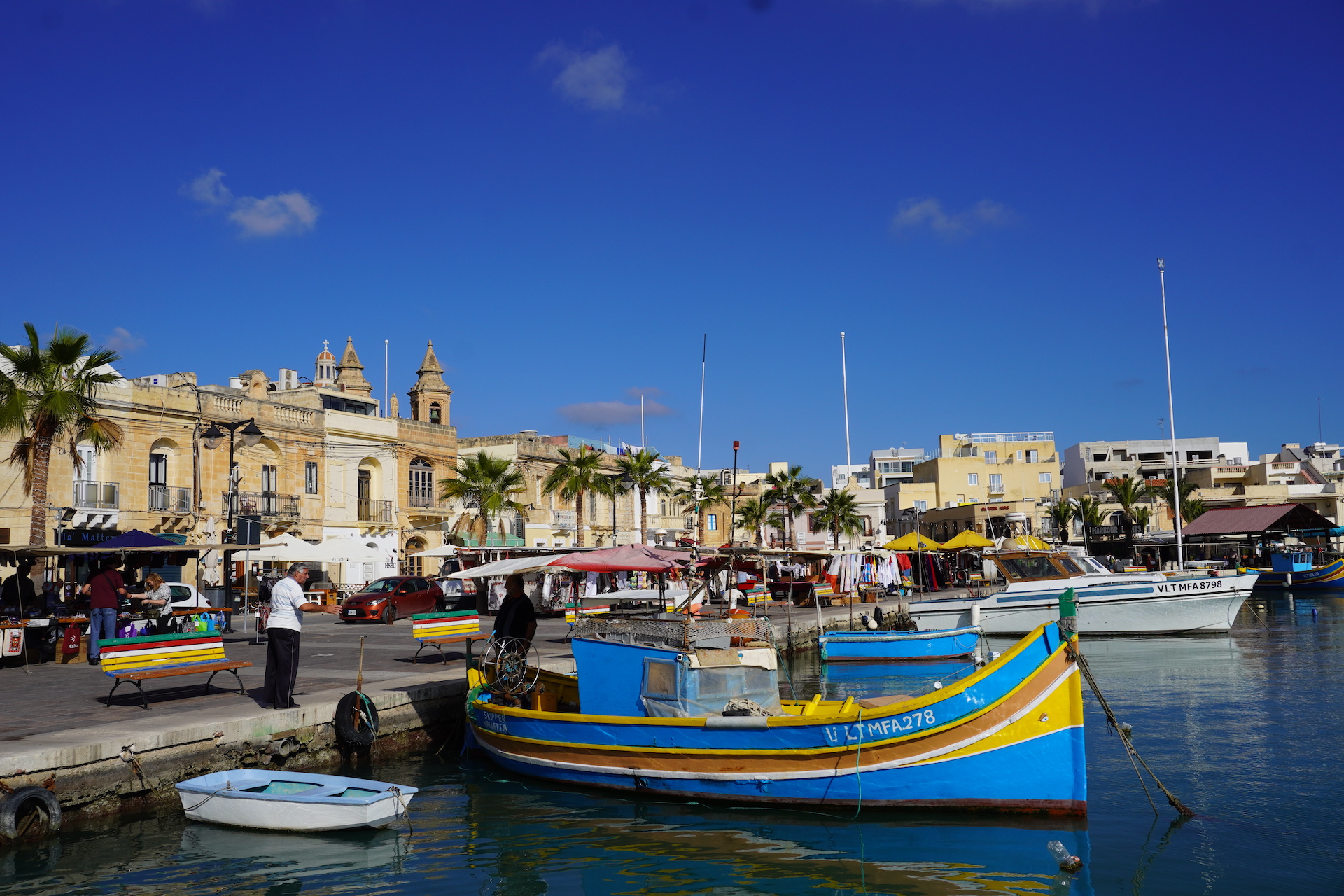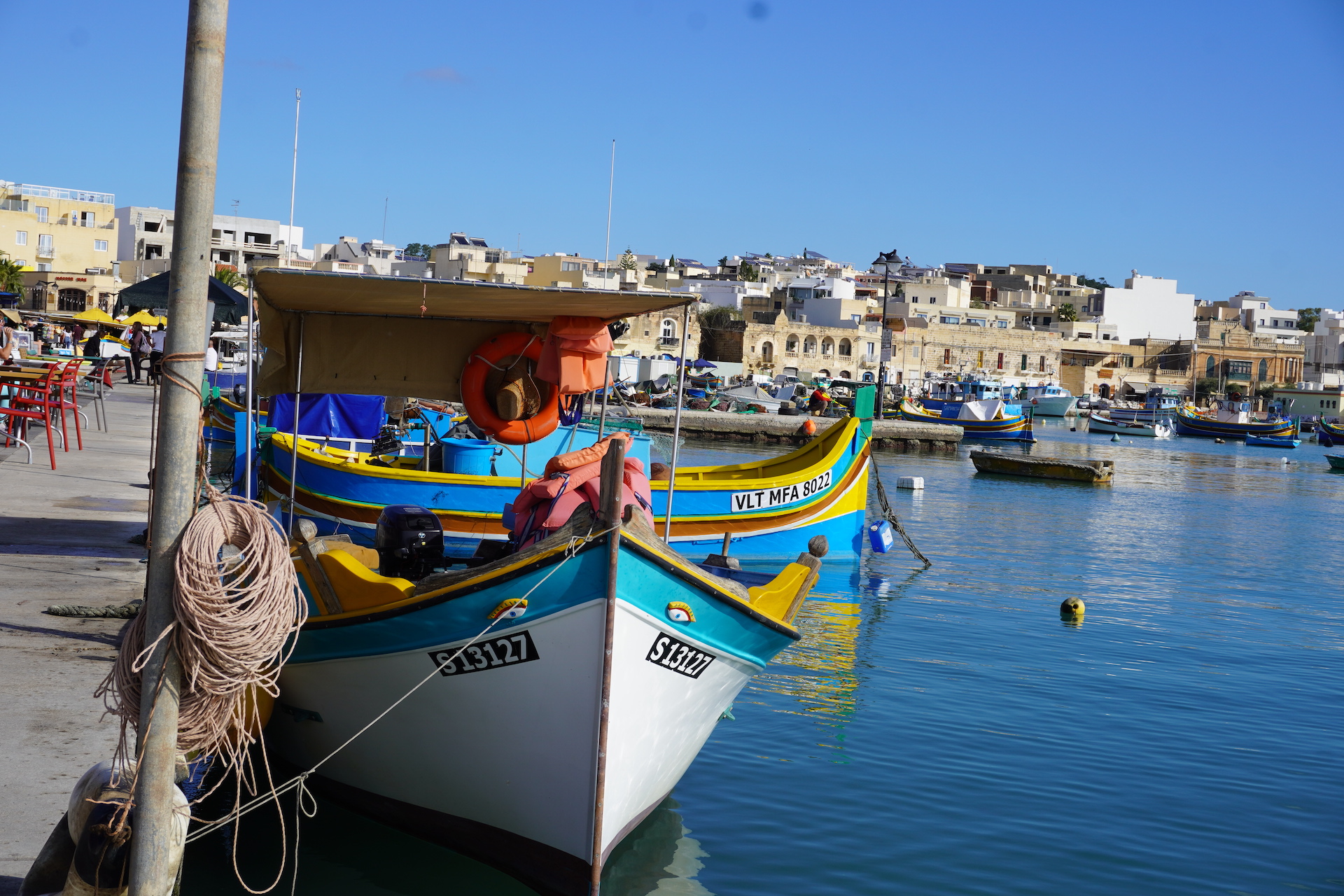 → Luzzu sind die traditionellen Fischerboote. Das besondere an diesen verzierten Booten sind die aufgemalten Augen. Die Malteser glauben, dass die leuchtenden Farben und Augen helfen, das Böse fernzuhalten.