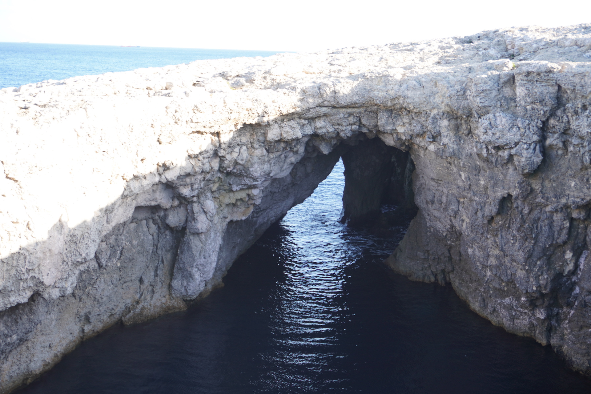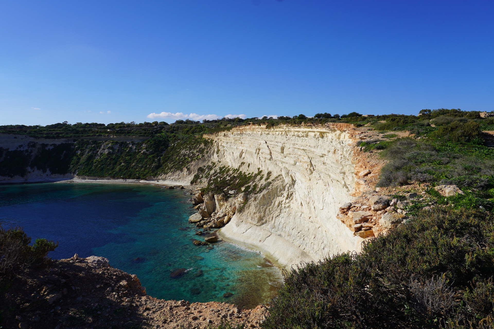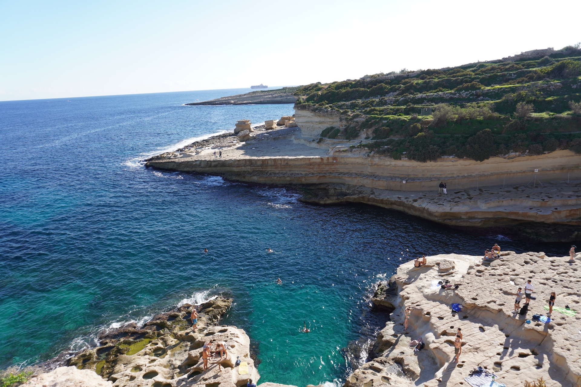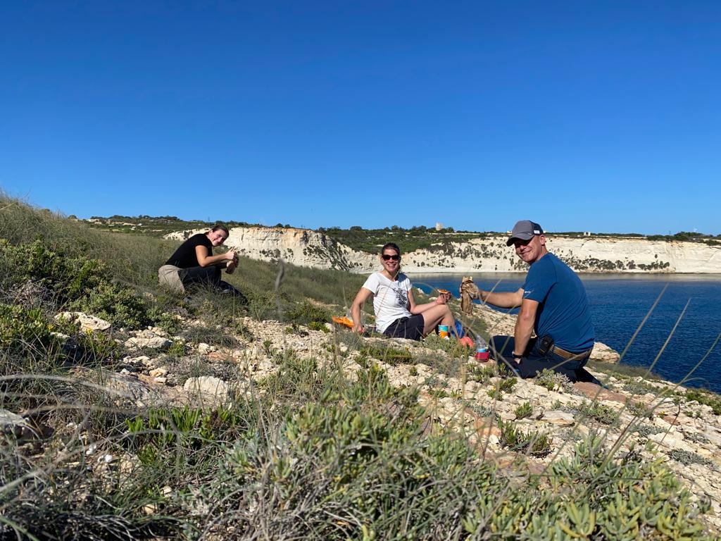 Wenn man mit einem Franzosen befreundet ist, weiss man auch, wo es die besten Baguettes zu kaufen gibt. Sogar in Malta gibt es sie und es machte Seebi dann «öppe» gar nichts aus, am Morgen mit nüchternem Magen einen Spaziergang zu der französischen Bäckerei unter die Füsse zu nehmen. «Läck» haben wir «geschmatz». So haben wir unser Frühstück schon lange nicht mehr genossen. Gut gestärkt und voller Tatendrang machten wir uns auf Richtung «Coral Lagoon». Diesen Insidertipp haben wir noch von Beat erhalten. Nachdem der sehnlichst erwartete Bus mit knappen 25 Minuten Verspätung eintraf – steuerten wir direkt unser Ziel an. Der bezaubernde Naturpool liegt am östlichsten Zipfel der Halbinsel Marfa. Das Meer hat sich hier einen kleinen Tunnel ins Innere gegraben und ein richtiges Loch geformt. Das Wasser ist, wie sollte es anders sein, glasklar und türkis. Jedoch scheint es auf den Fotos nicht ganz so – da die Sonne nicht mehr den perfekten Stand hatte.