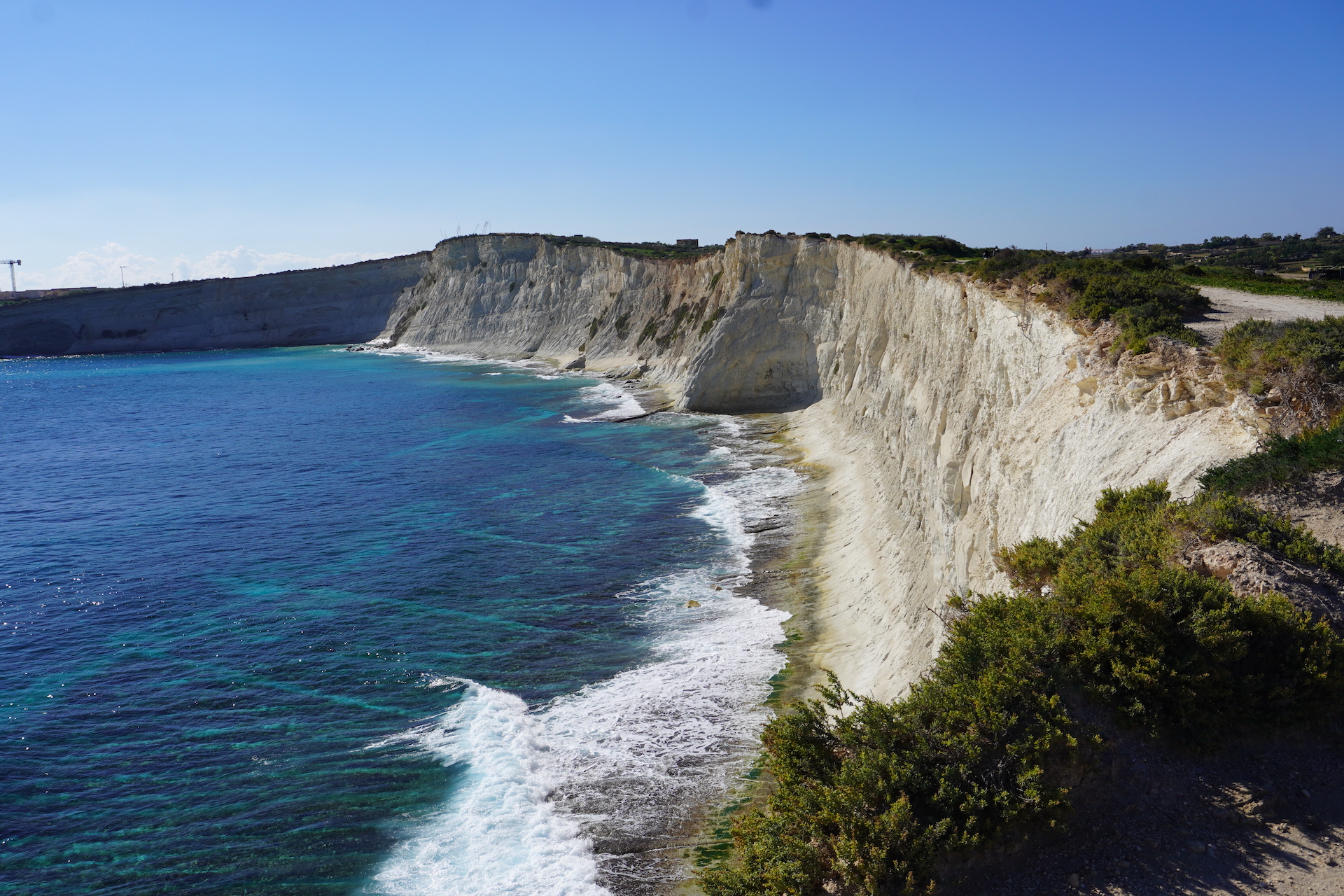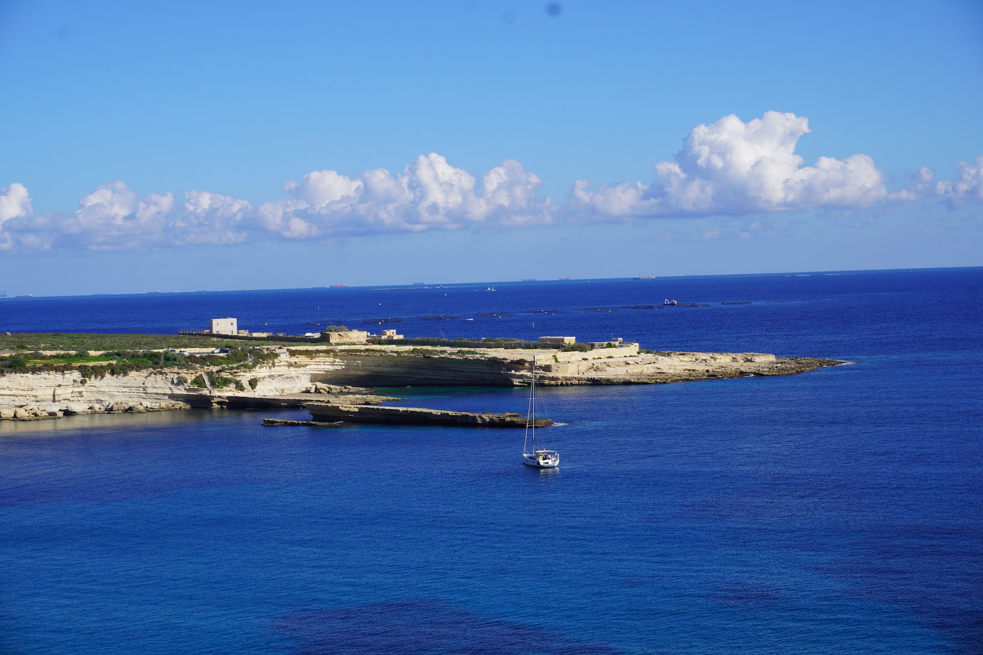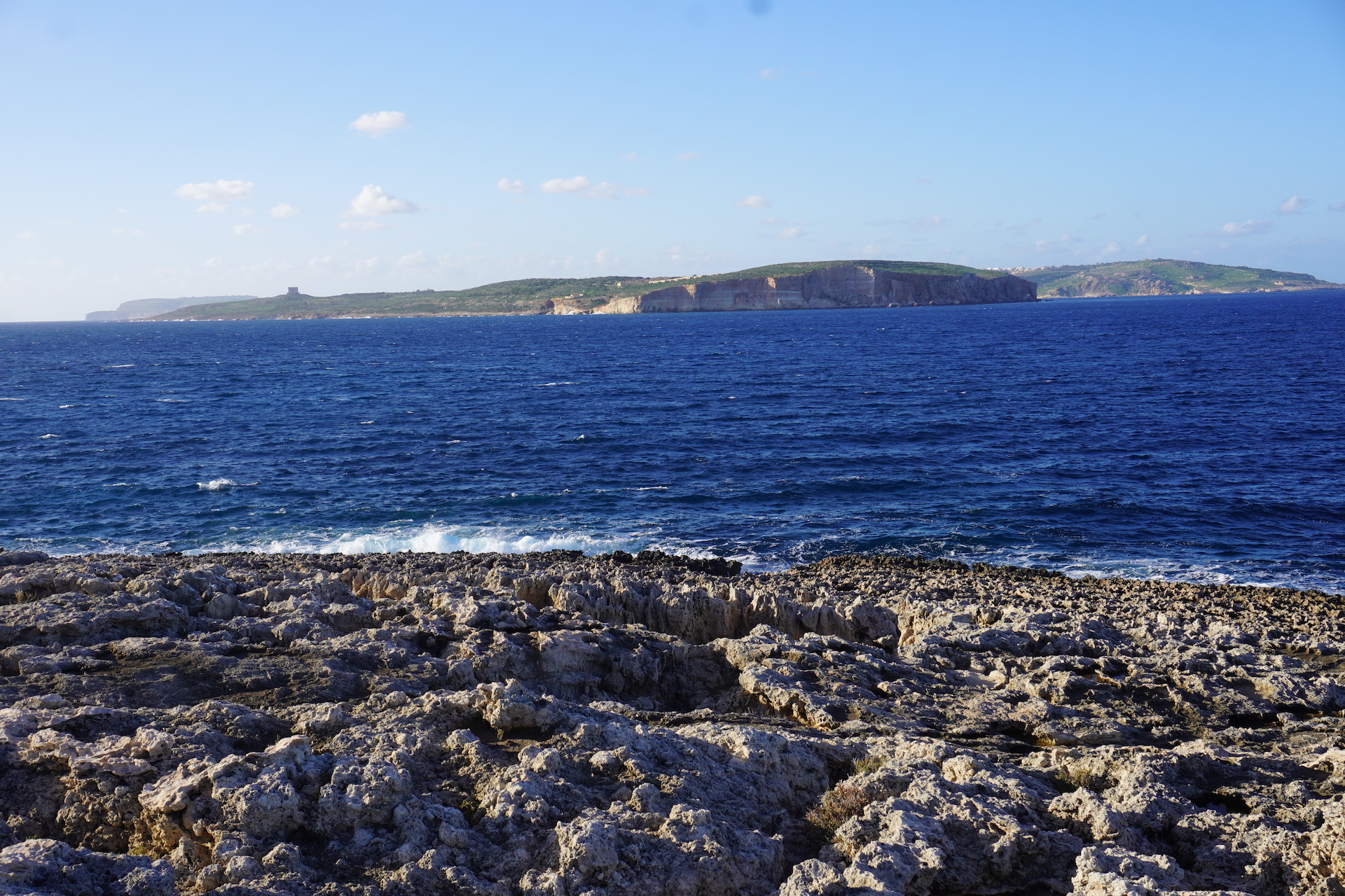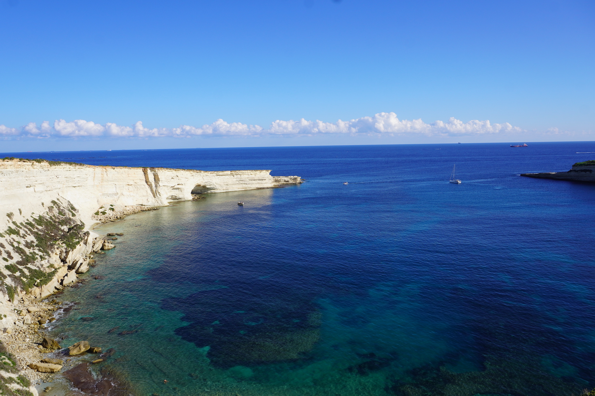 Wenn man mit einem Franzosen befreundet ist, weiss man auch, wo es die besten Baguettes zu kaufen gibt. Sogar in Malta gibt es sie und es machte Seebi dann «öppe» gar nichts aus, am Morgen mit nüchternem Magen einen Spaziergang zu der französischen Bäckerei unter die Füsse zu nehmen. «Läck» haben wir «geschmatz». So haben wir unser Frühstück schon lange nicht mehr genossen. Gut gestärkt und voller Tatendrang machten wir uns auf Richtung «Coral Lagoon». Diesen Insidertipp haben wir noch von Beat erhalten. Nachdem der sehnlichst erwartete Bus mit knappen 25 Minuten Verspätung eintraf – steuerten wir direkt unser Ziel an. Der bezaubernde Naturpool liegt am östlichsten Zipfel der Halbinsel Marfa. Das Meer hat sich hier einen kleinen Tunnel ins Innere gegraben und ein richtiges Loch geformt. Das Wasser ist, wie sollte es anders sein, glasklar und türkis. Jedoch scheint es auf den Fotos nicht ganz so – da die Sonne nicht mehr den perfekten Stand hatte.