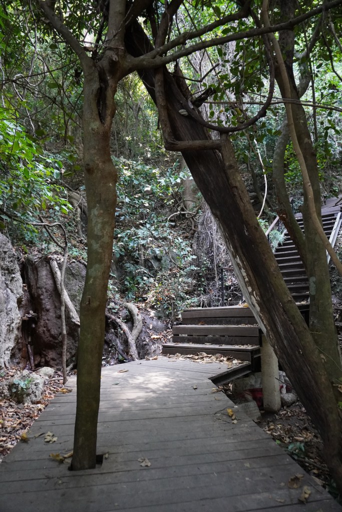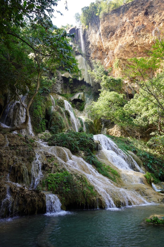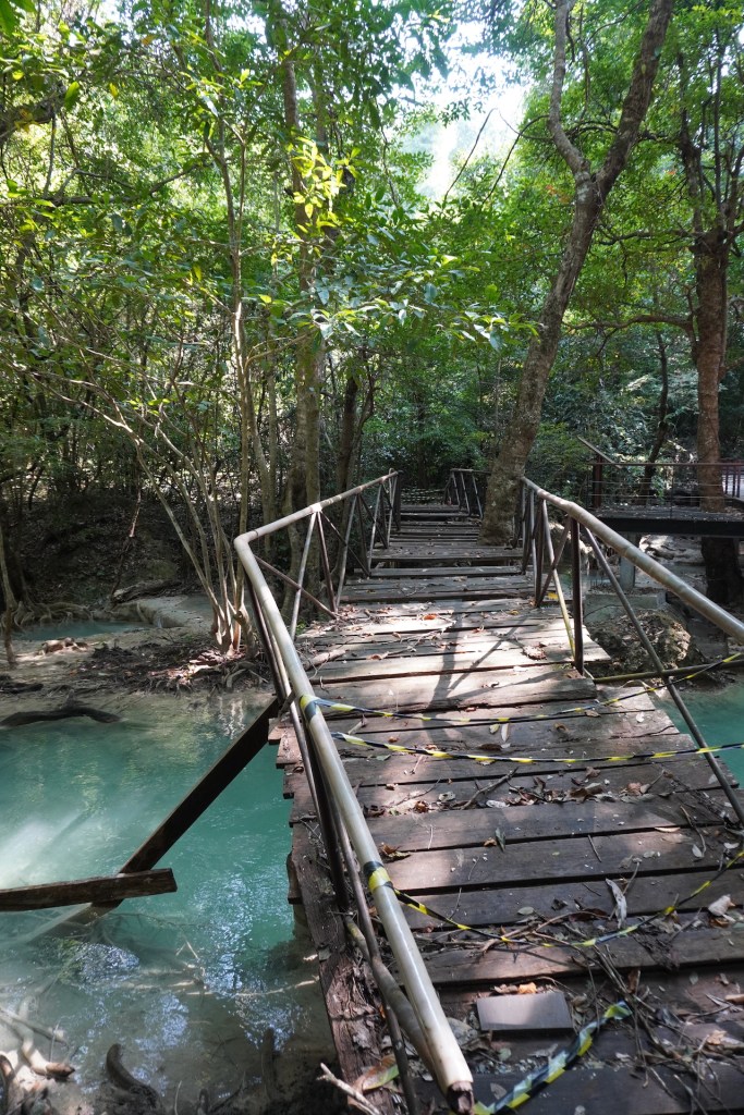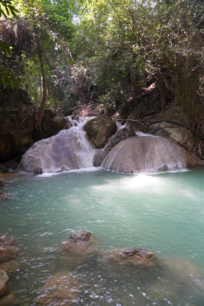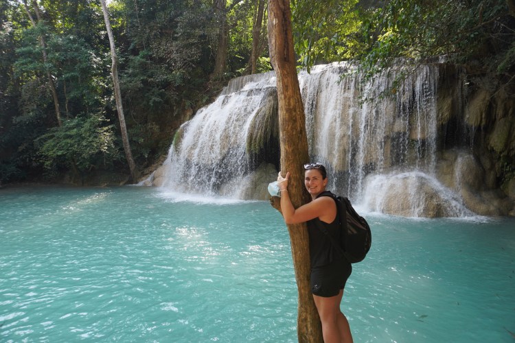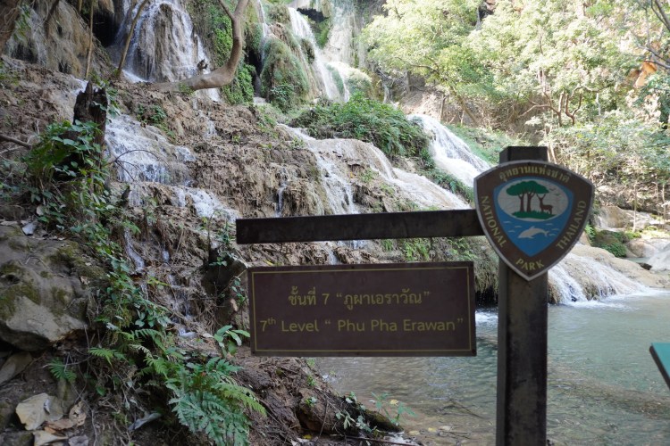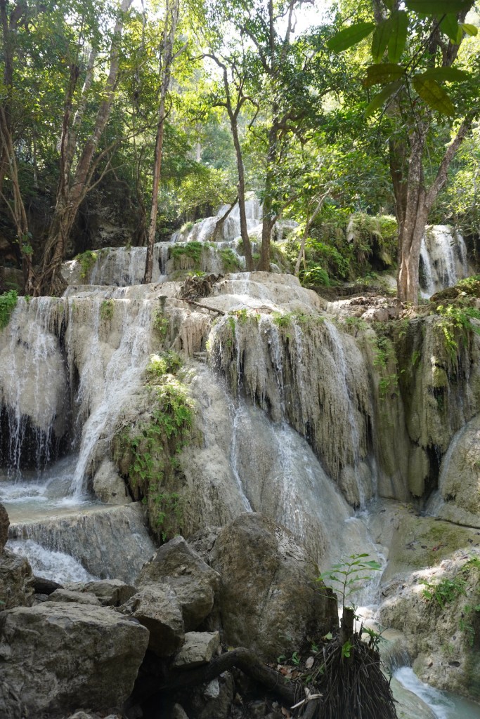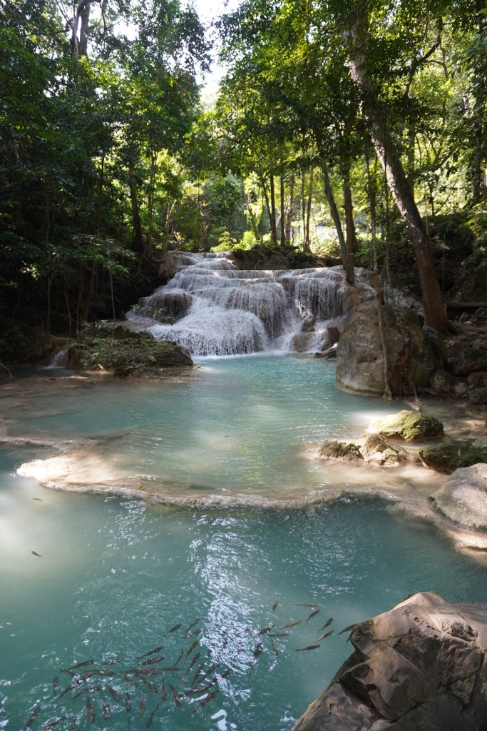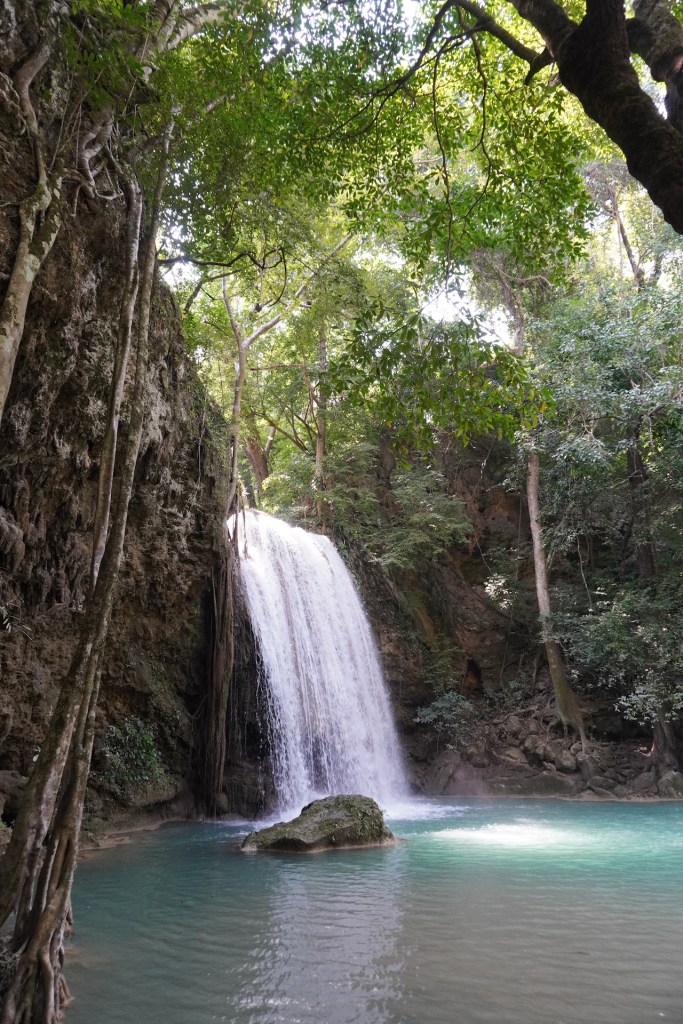 Die Hauptattraktion im Erawan-Nationalpark ist der 7-stufige Wasserfall. Ein idyllischer Weg führt durch den satt grünen Dschungel entlang am Fluss. Das Wasser ist glasklar und die jadefarbenen Pools laden zum Baden ein. Eine nette Abkühlung – zum schweisstreibenden Aufstieg. Die ersten zwei Ebenen sind für die meisten Besucher leicht zugänglich – ab der 5. Stufe verwandelt sich dann der Weg in einen Naturpfad und entsprechend werden die Touristenmassen kleiner und kleiner. Mitten im Dschungel kletterten süsse «Javeneraffen» in den Bäumen – süss diese kleinen Fratze. So viel schöne Natur war eine nette Abwechslung zum bis anhin eher hektischen Thailand.
