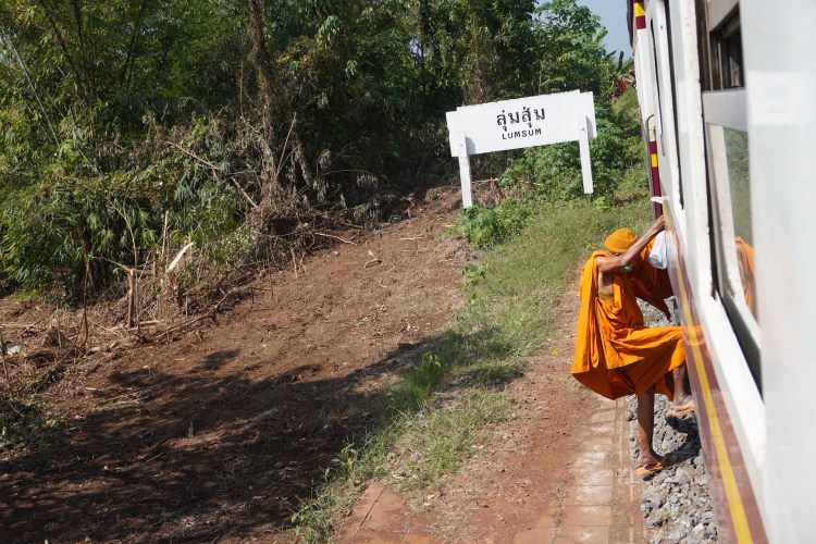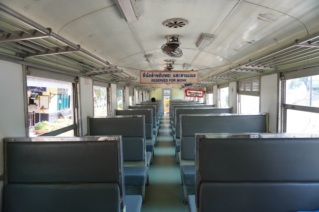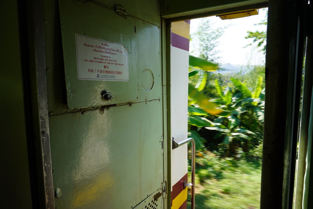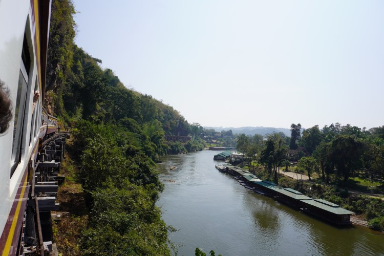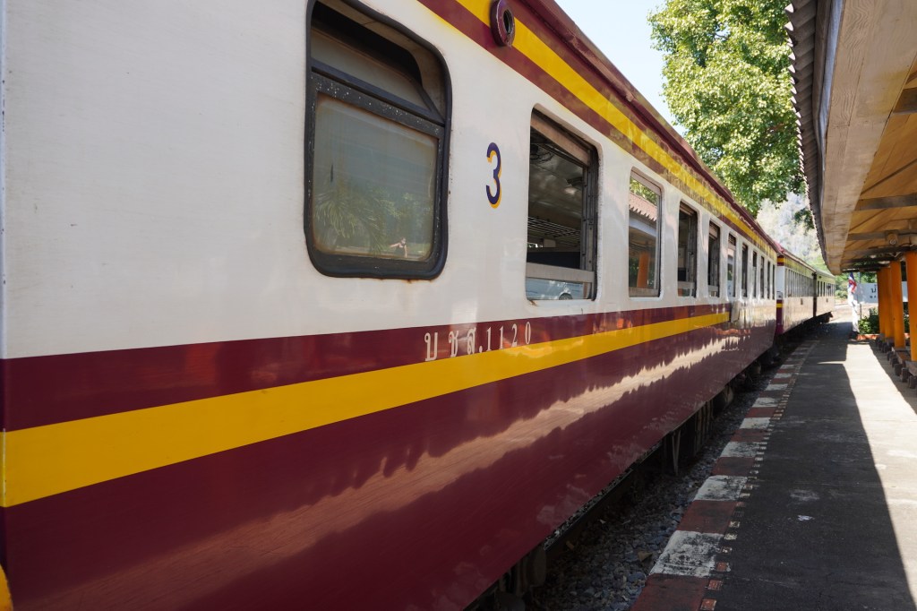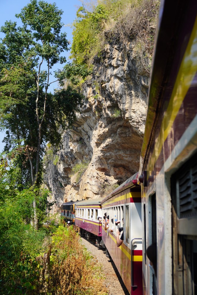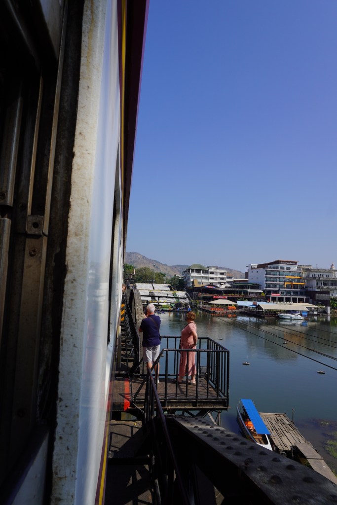 Wir besorgten uns Bahnticket und ergatterten einen Platz in der 3. Klasse. Wir überquerten im Schritttempo das berühmte hölzerne «Wam Pho-Viadukt». Ja das war wirklich ein Erlebnis der besonderen Art. Der Blick auf den «River Kwai» war wundervoll und jener in die Tiefe auf dem schwindelerregenden Holzkonstruktion Wam Pho-Viadukt etwas «grüsslig», dennoch sehr imposant. Auch die ganze Zugfahrt war ein Spektakel. Die offenen Türen bei der Zugfahrt, die Haltestellen wo nur aus einem Holzschild bestehen, das Zugabteil für Mönche, die Verkäuferinnen, die für ein paar Rappen Essen und Getränke verkaufen…., ja die Erinnerung an diesen Tag bescheren uns noch immer ein Lächeln auf unsere Gesichter.