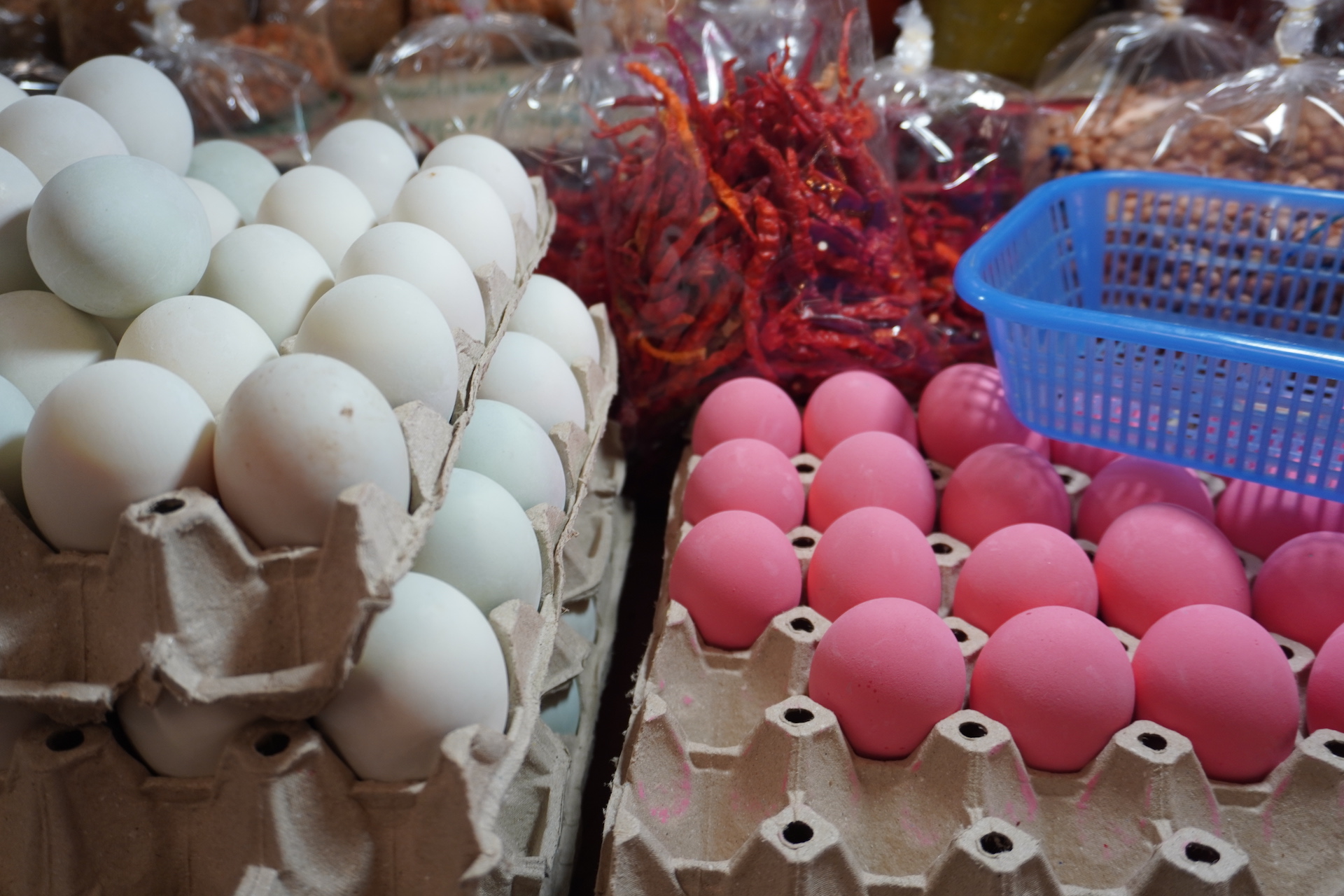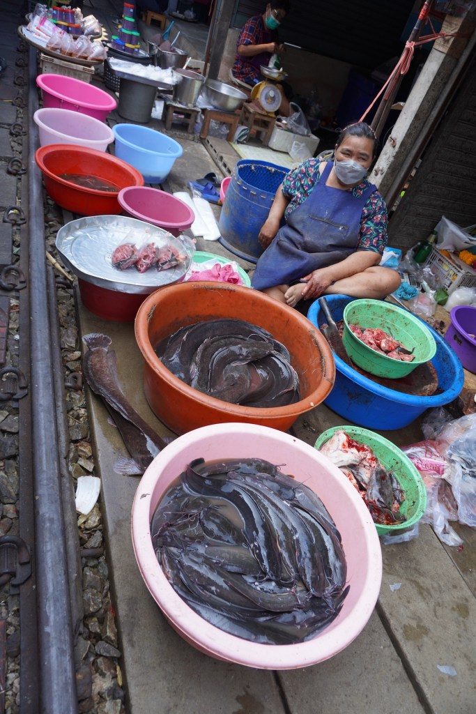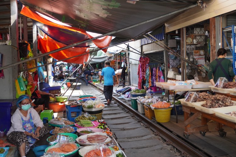 Einkaufsbummel auf Schienen. Der «Maeklong Railway Market» in der Provinzhauptstadt «Samut Songkhram» ist eine Sensation. Ein Markt auf Zuggleisen. Ob Früchte, Gemüse, Fisch, Fleisch – entlang der Zuggleise der «Mae Khlong-Maha Chai Linie» wird man fündig. Bei der aktiven Bahnstrecke verkehren täglich mehrmals Güter- und Personenzüge. Und dass auf diesem Markt die Mäuse neben dem Fleisch, welches am Boden liegt, rumlaufen – stört dann «öppe gar» niemanden – ausser vielleicht da diese zwei Schweizer. *görbsli*