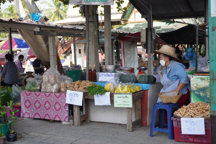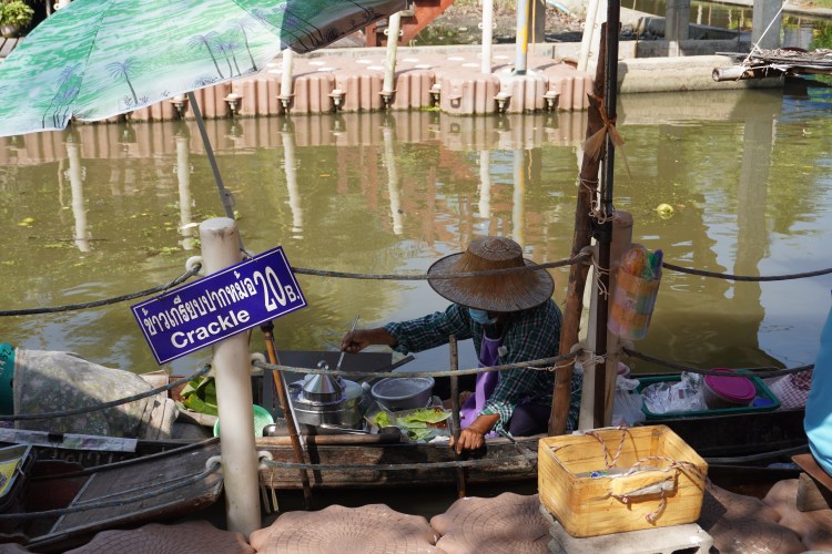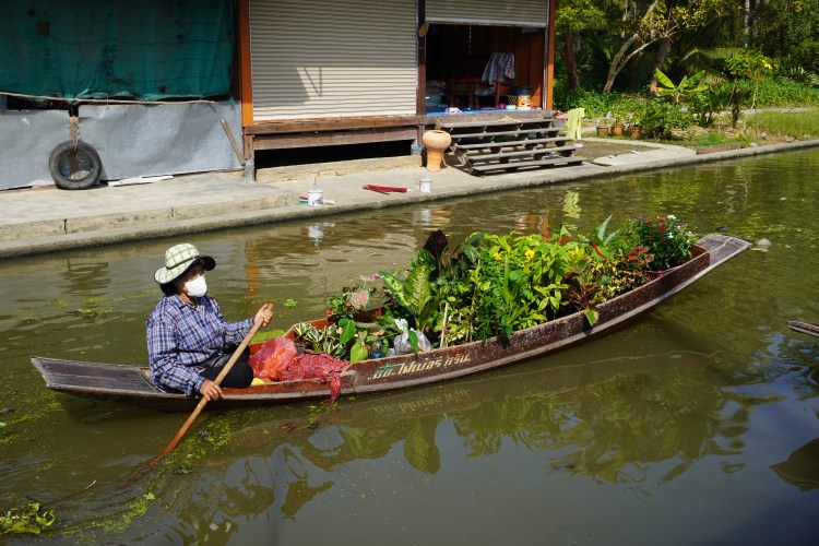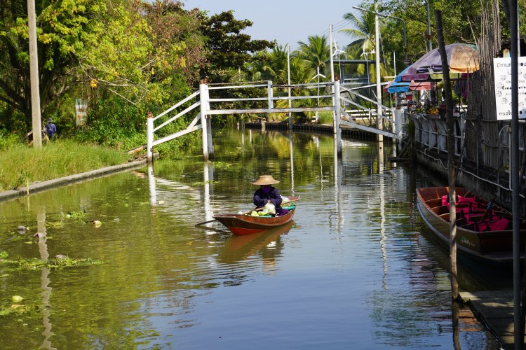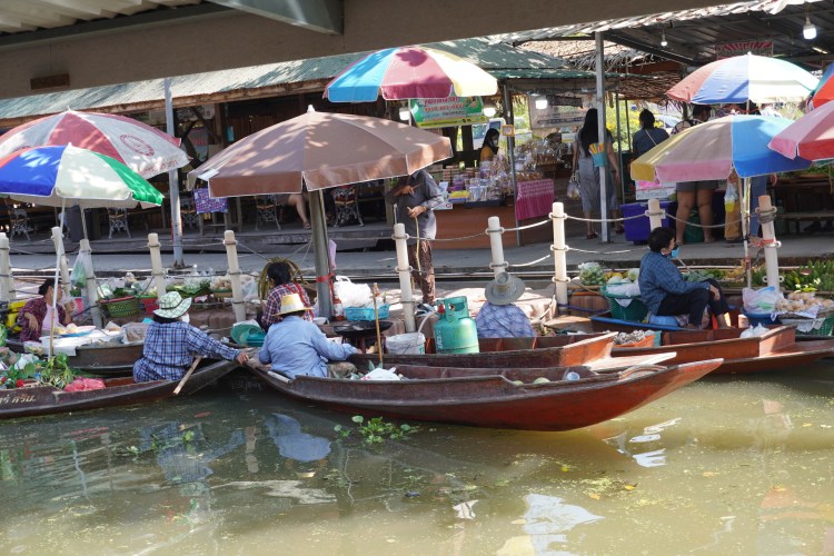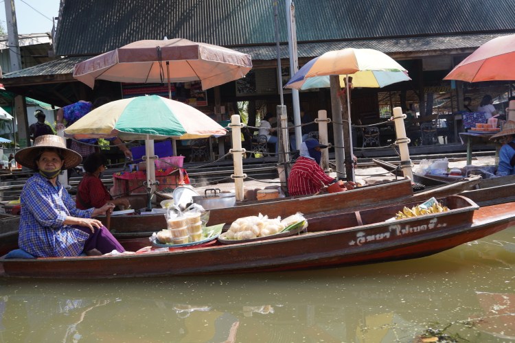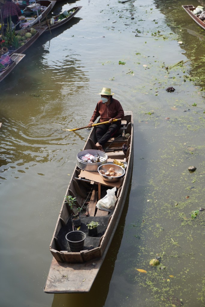 Samstags-Markt mal anders. Und das gleich zwei Mal. Am Vormittag besuchten wir den zauberhaften Markt «Tha Kha Floating». Ein ganz einfacher dafür sehr authentischer Floating Markt – ein schmucker Juwel. Er ist seit über 60 Jahren ein Teil des kleinen, angrenzenden Dorfes. Der zauberhafte Markt spielt nicht auf einem Platz statt, sondern in Booten. Die lokalen Bauern und Fischer sitzen ganz gelassen in ihren «Longtailboats» und verkaufen frische Blumen und Lebensmittel. Auch als Garküchen werden diese genutzt. Auf dem Markt geht es gemütlich und bescheiden zu und her. Der Markt blieb bis anhin vom Massentourismus verschont und so vielen wir zwei «Farangs» auf wie bunte Hunde.