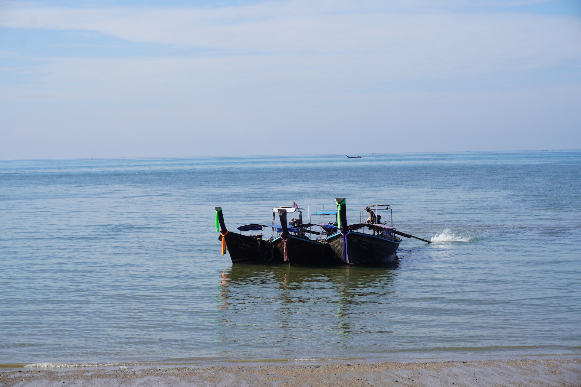 Am 2. Januar machten wir uns in der Früh auf Richtung Krabi. «Ao Nang» war unser Ziel. Mit dem Taxi fuhren wir an den Fähre-Hafen. Die Fähre hatte wohl so vor dreissig Jahren ihre besten Zeiten. Es war – gelinde gesagt, etwas schmuddelig und die Gerüche alles andere als appetitlich. Wieder Festland unter den Füssen wurden wir in einen Minibus verfrachtet. Die erste Teilstrecke war ganz in Ordnung. Nachdem wir an der Haltestelle etwas herumgeschoben wurden – klappte es dann jedoch doch mit dem zweiten Teil der Fahrt. Und wie! Oftmals werden in diesen Minivans nicht nur Menschen und ihr Gepäck transportiert – alles was sonst noch irgendwie Platz hat, wird halt «reingestopft». Ela kamen die weissen Säcke von Anfang an irgendwie suspekt vor – aber: Augen zu und durch! Jedoch so nach drei Stunden klebten dann die Füsse dermassen in diesem Saucen-Matsch und der Geruch wurde intensiver. Leider waren nicht nur unsere Füsse nass, nein auch unsere Backpacks standen schön darin. Beim Busbahnhof – welcher sich ab vom Schuss befindet – besorgen wir uns ein Tuk Tuk. Aber der Fahrer hatte noch weniger Ahnung, wohin wir wollten, als wir selbst. «Läck» war das ein Desaster. Wir liefen dann zu einem Hotel – wo uns dann ein richtiges Taxi organisiert wurde – damit wir noch vor Sonnenuntergang eingecheckten konnten.